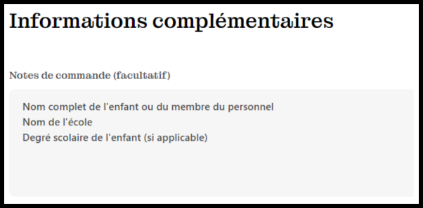 Vérifiez votre panier pour vous assurer que tous les éléments y ont été ajoutés. !IMPORTANT! Avant de valider votre commande, vous devez inscrire le nom complet de l’enfant dans la case prévue à cet effet.